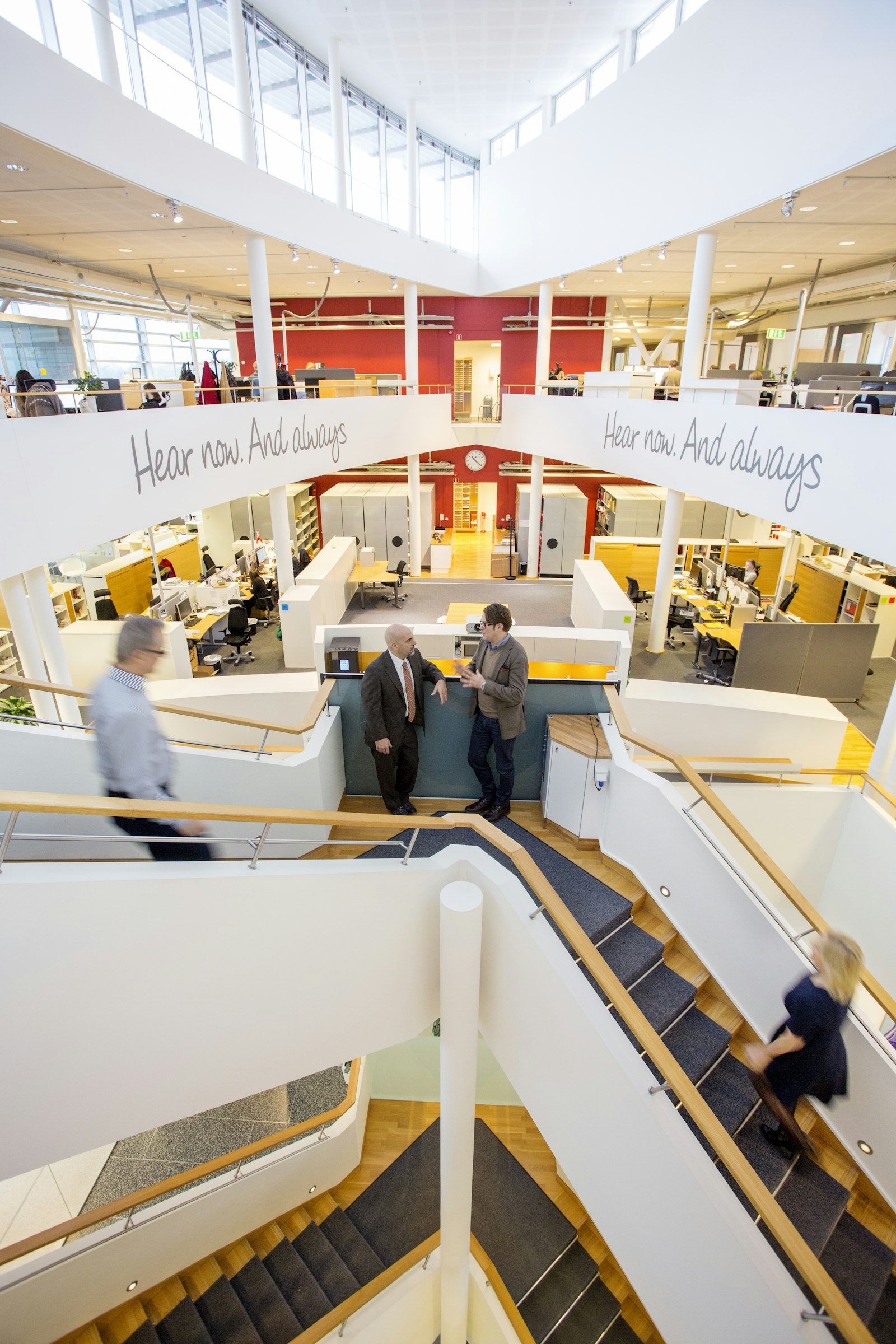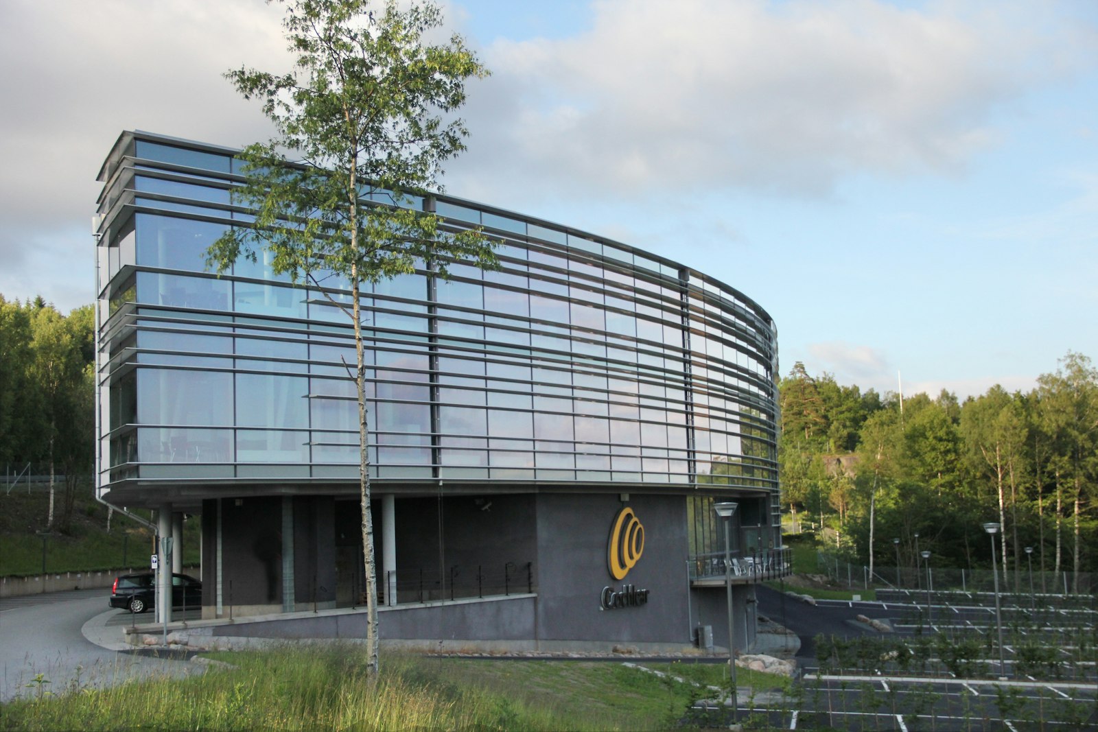 Byggnadens södra sida präglas av glasfasad med utsikt över Rådasjön, vilket ger goda ljusförhållanden och en öppen arbetsmiljö.