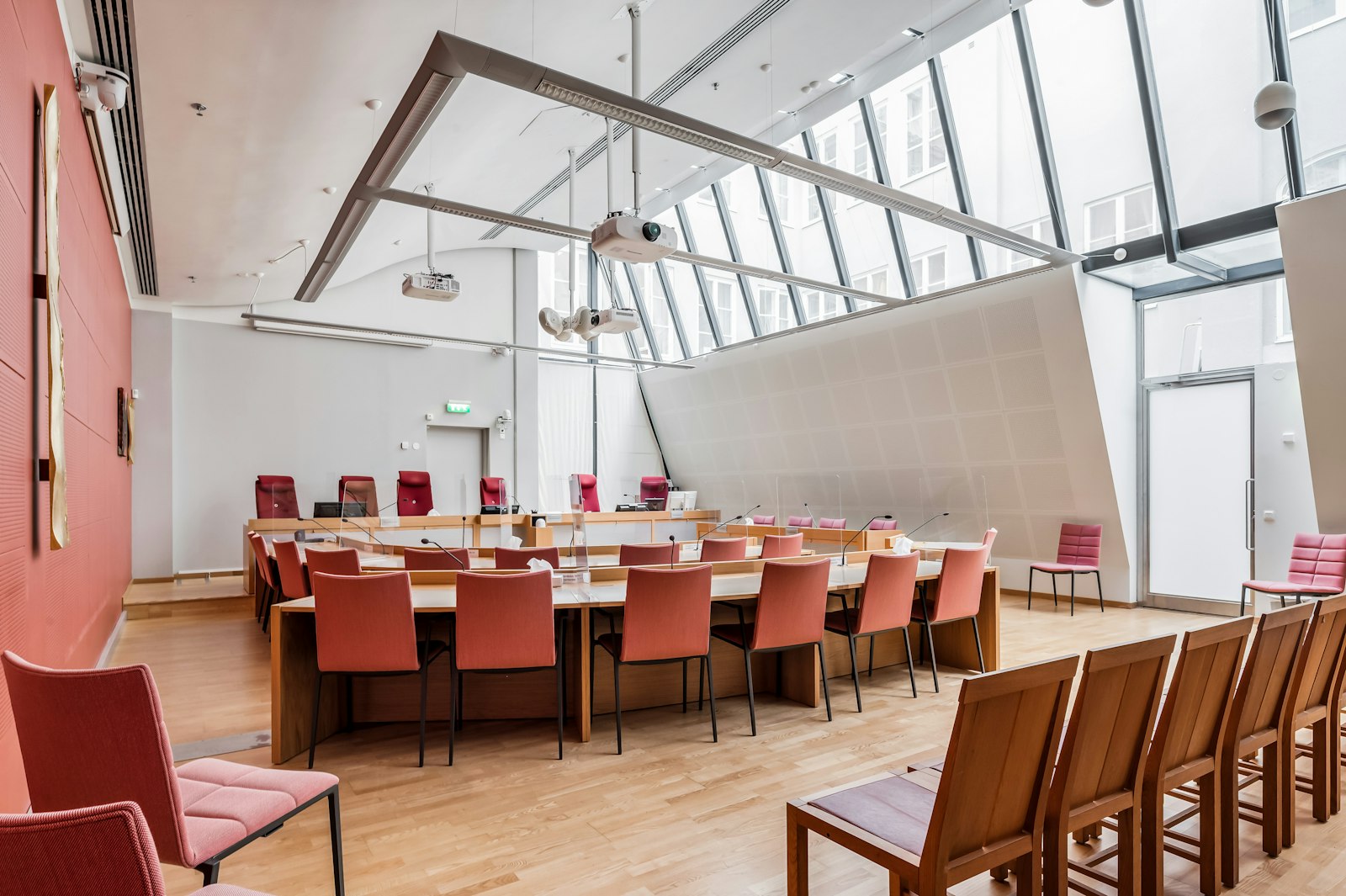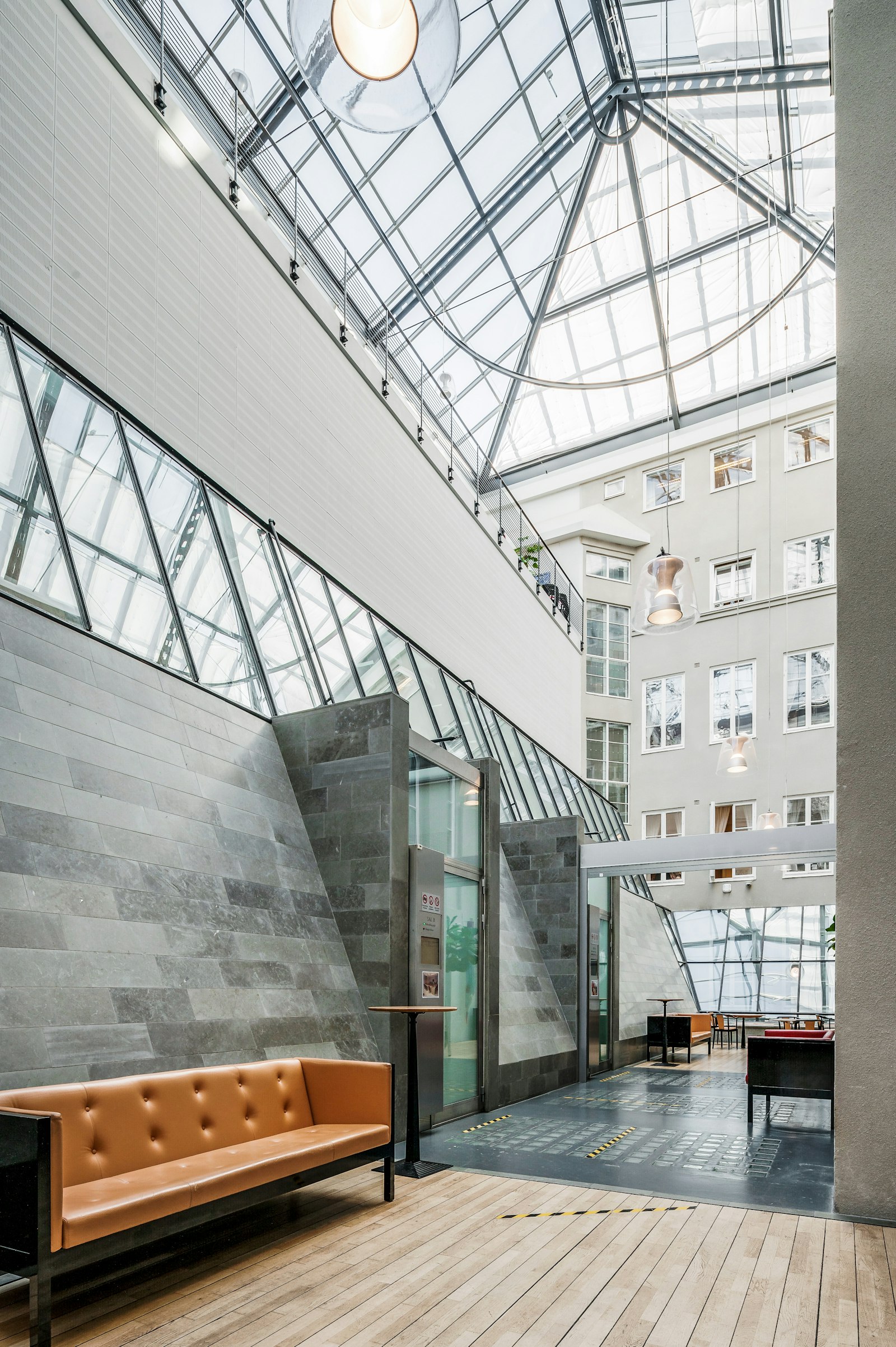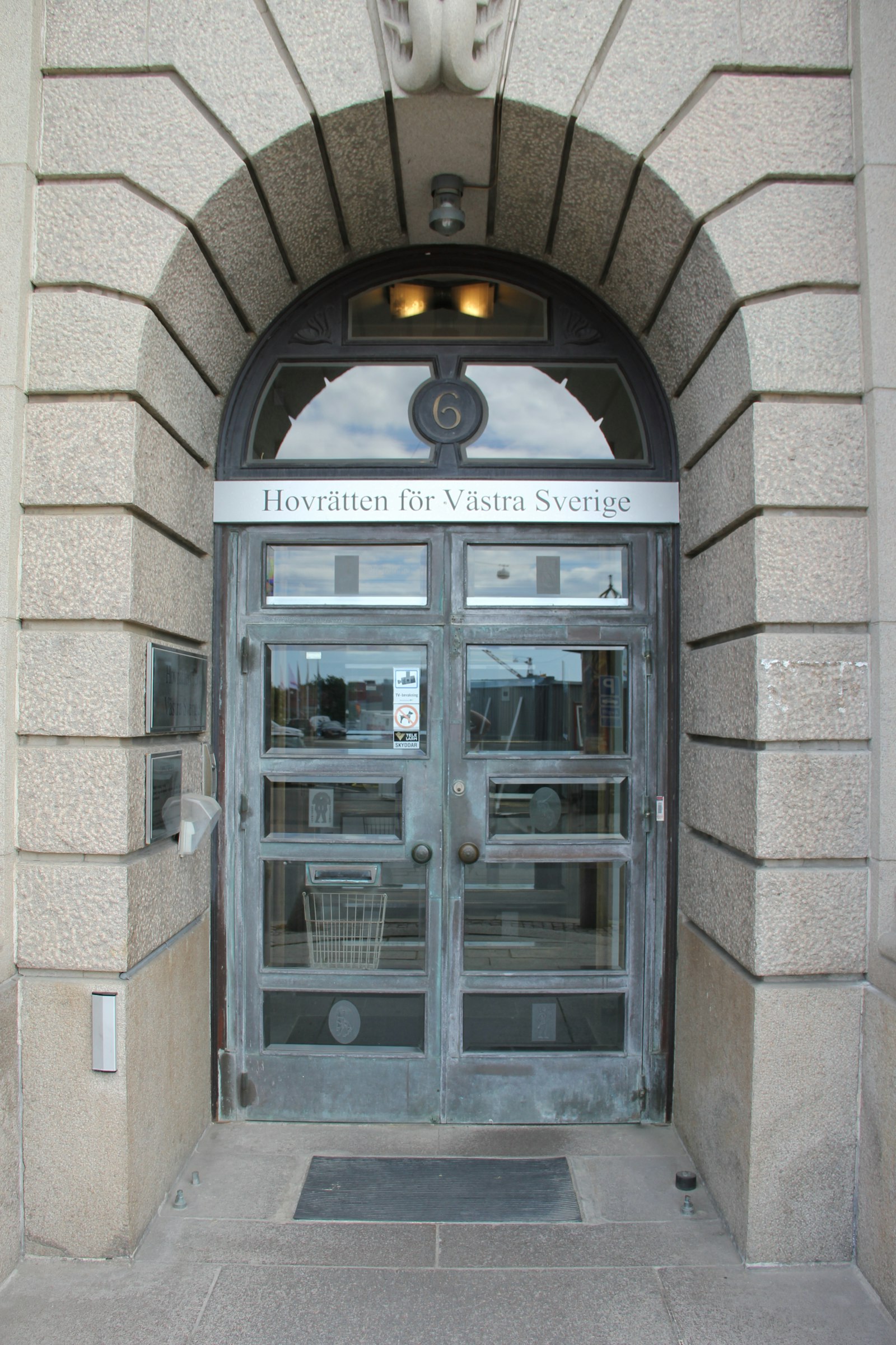 Entrén välkomnar besökare med reception och ett karaktärsfullt trapphus. Från de övre planen nås ljusa utrymmen med generösa takhöjder och ett centralt placerat ljusinsläpp via glastak. Lokalerna är idag anpassade för domstolsverksamhet med salar och cellkontor, vilket speglar fastighetens representativa karaktär.