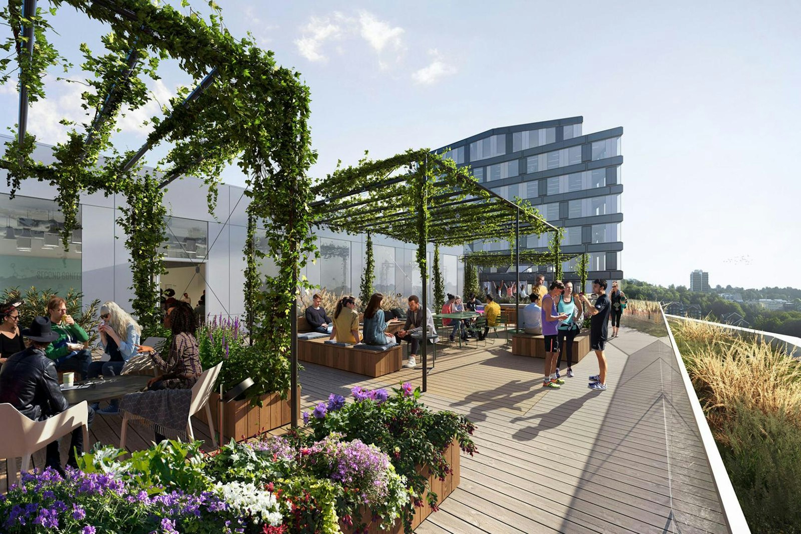 I huset finns bland annat träningsanläggningen SATS, hälsosamma matalternativ, två terrasser för avkoppling eller möten i friska luften samt Mindpark, som erbjuder konferensytor och service för både små och stora behov.